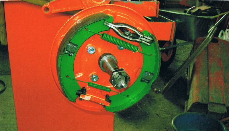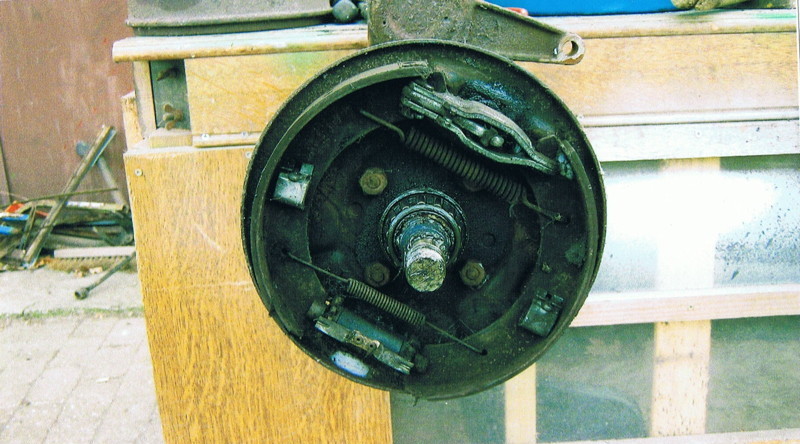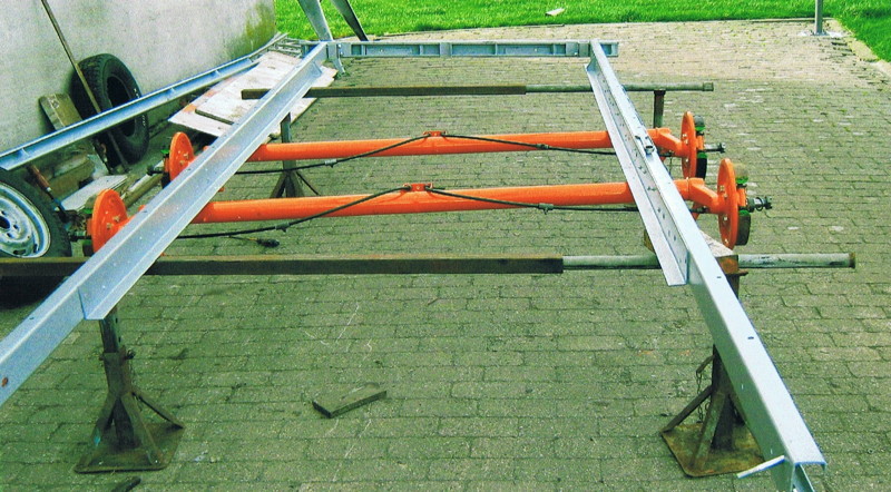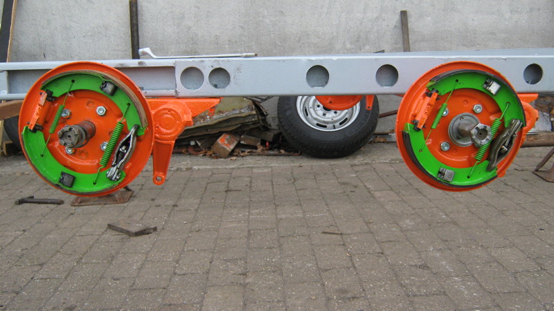 Dan startte ik met de Comet-assen er onder te plaatsen. In het chassis waren verschillende gaten voorzien waarin mijn assen konden gemonteerd worden. Vervolgens begon ik met de uitlijning van de assen t.o.v. elkaar. Daar het chassis in elkaar gezet is met bouten, kan je de hele bazaar scheef en scheel in elkaar zetten. De uitlijning heeft wel 2 dagen in beslag genomen. Dubbelassers moeten perfect op elkaar afgestemd staan. Anders krijg je abnormale bandenslijtage en gaat alles wringen achter de wagen. De aanpassing van het remsysteem was het volgende werkpunt. Ik heb het laatste nieuwe remsysteem toegepast wat er op de markt te krijgen was. Omdat dit systeem de kabels samen activeert.