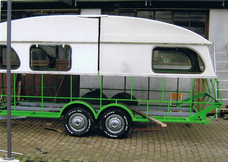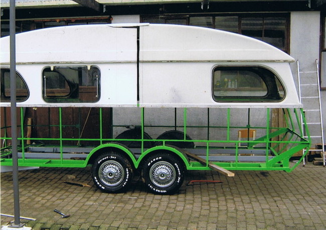 Remschoenen, lagers en dichtingen zijn vernieuwd. Als dit in orde was, begon ik aan de kooi van de caravan. De kooi is het profiel dat achter de aluminium beplating zit. Als groene constructie te zien op de foto's. Dat is op het chassis geplaatst met 18 bouten. Daarna begon ik aan de beplating volledig rondom in het aluminium. Deze heb ik een halve mm dikker genomen dan normaal, wat het hele gevaar steviger maakt. Daarna kwam het dak erop, gevormd van 2 daken via demontage Constructam Comet's. 1 grote voorhelft en 1 grote achterhelft. Het ene dak kwam van een Comet bouwjaar 1970, het andere van bouwjaar 1971. Wat problemen veroorzaakte omdat het polyester van het ene dak dikker was dan het andere. Waar achteraf nog veel werk kwam bij kijken om dit aangepast te krijgen. Uiteindelijk is me dit toch gelukt.
