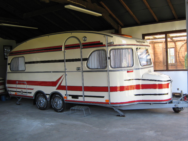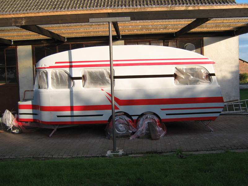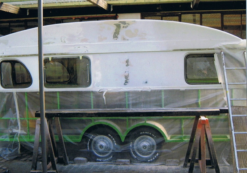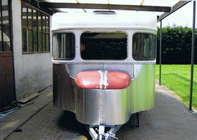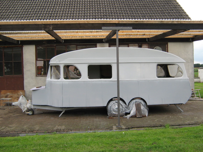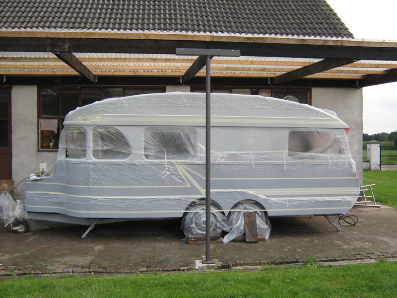 Toen begon het spuitwerk! Eerst het spuiten aan de buitenzijde. Het nieuwe aluminium werd eerst geschuurd en in een speciale ondergrond aangebracht. Met al deze kleuren en laklagen ben ik 3 weken bezig geweest. Droogtijd kan je hierbij in acht nemen. 30 rollen plakband erdoor gejaagd. Daarna de chroomlijsten plakken en de verlichting monteren aan de buitenzijde voor de wagen.