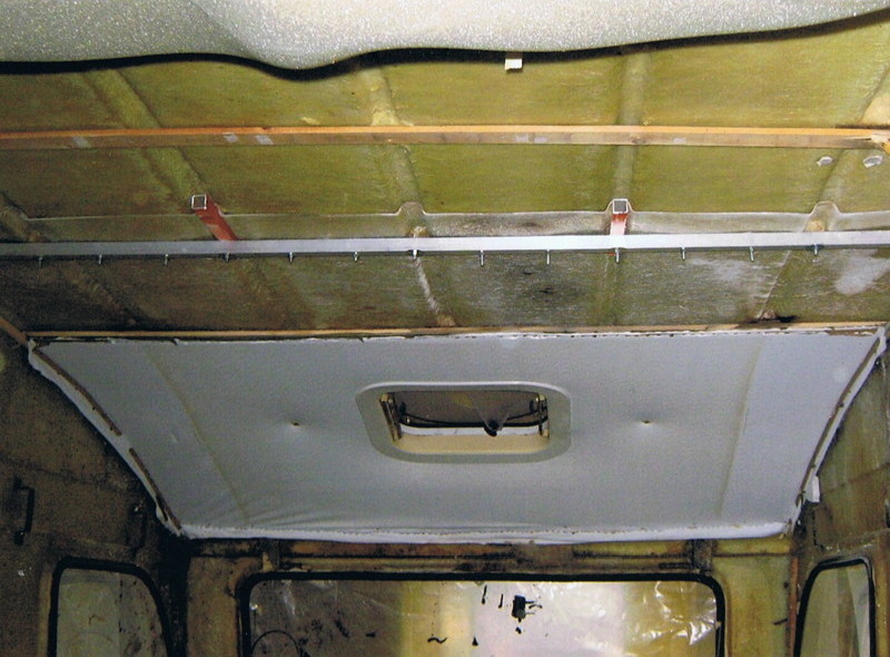 Tenslotte werd het dak er terug afgetakeld om te plamuren en te schuren. Bewerken met polyester en het spuitwerk dienden uiteraard ook nog te gebeuren. De vloer werd aangepakt, eenmaal watervaste plaat van 10mm dik. Daarna 30mm isolatie met om de 30cm een aluminium profiel. Telkens terug een watervaste plaat van 10mm dik enz.