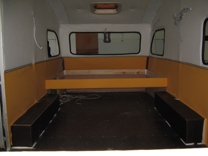 Isolatie en bekleding werden in de wanden en het plafond aangebracht. Alsook nieuwe bedrading achter de bekleding voor alle toestellen. Dan was de vloerbekleding aan de beurt, dat was zo geflikt. De meubeltjes en hangkasten waren van een Comet bouwjaar 1969. Ook de rondingen van de kastjes moesten aangepast worden aan het plafond.