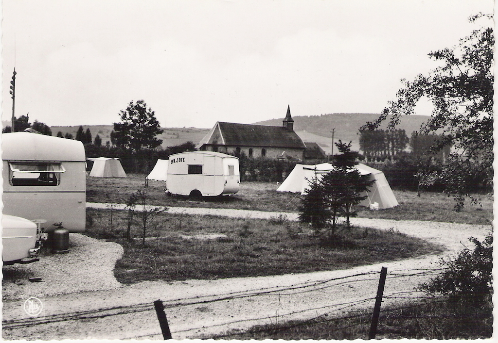 De camping ziet er wat verlaten uit. Voor het kerkje zien we een caravan staan van engelse makelij.