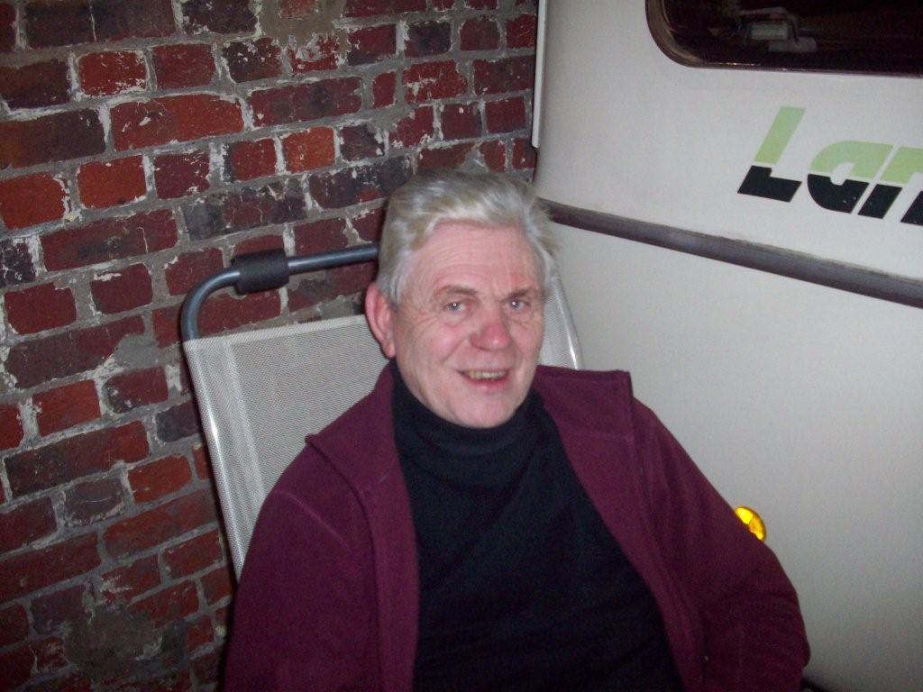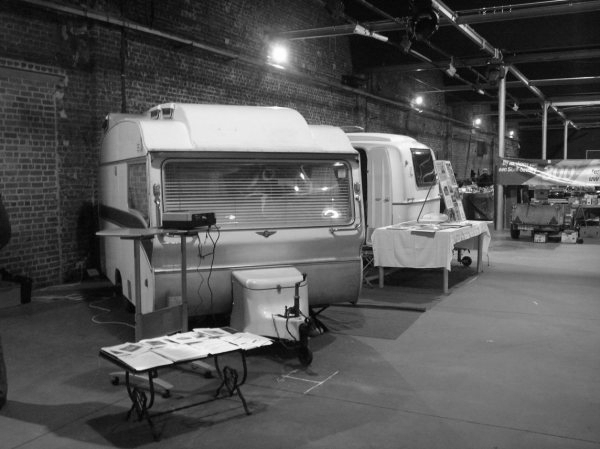 Als in een soort trance lopen ze de stalen trap af en komen in een compleet lege hal te staan: Geen onderdelen, geen auto’s, geen overige bezoekers, er is totaal niets. Behalve dan in de verte die caravans en die man met hoed. Enkele stappen later is er een enthousiast onthaal en zit men al snel op de klapstoeltjes. Verhalen over het afgelopen jaar, plannen voor het komende seizoen, lief en leed, alles komt ter tafeltje. Ondertussen lekker snoepend aan de spekjes en de koekjes.