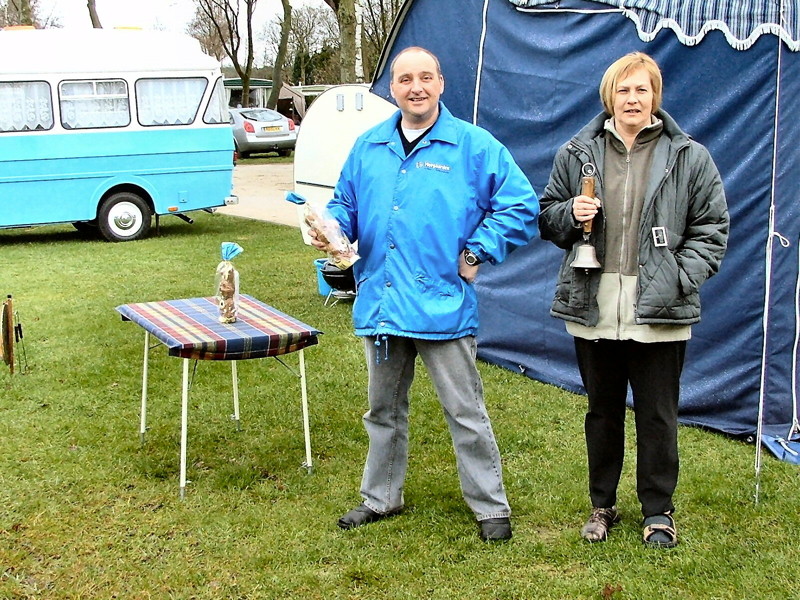 Dennis en Hilde hadden voor een leuk en origineel verwelkomingspakket gezorgd. Daarin o.a. twee met chocolade eitjes gevulde koffietassen en nog wat andere attributen. Bovendien vond iedereen op eerste paasdag nog een chocolade paashaas bij zijn caravan. De tassen konden gebruikt worden aan de koffiebar bij hun Notin. Daar was het zowieso elk uur van de dag wel een ontmoetingsplaats. Op het eind van het weekend kon Dennis meedelen dat er 330 stuks van dit verslavende vocht waren geconsumeerd. Let op: alleen aan zijn bar! In de diverse caravans zal nog wel een veelvoud genuttigd zijn. Bij onze aankomst moesten we nog door een bareel zien te geraken. Daarvoor waren er pasjes nodig en juist die waren te weinig voorhanden. Geen nood, wanneer er gezamenlijk op uit gegaan moest worden was er een sluipweg en anders, voor de grotere com- binaties was er wel een pasje te vinden bij een van de leden. Nadat we onze Mostard hadden geinstalleerd (onze vrienden Pelckmans hadden een mooie plek naast hen vrij gehouden) konden we de andere clubleden begroe- ten. Daarbij waren we blij Katja en Kris weer terug te zien. Deze keer waren ze met een mooi gerestaureerde Otten Kruiser. Naar het schijnt is dat een nogal zeldza- me caravan. Vorig najaar waren ze ook al van de partij, maar toen was ondergetekende er niet bij. Om 13.00 uur die middag stond de traditionele jaar- vergadering en nieuwjaarsreceptie op het programma. Dat gebeurde in een grote tent die de camping ter beschikking had. Nadat voorzitter Bob een welkomst- woordje had afge- stoken, en zei verheugd te zijn over de grote opkomst ondanks het slechte weer, werd teruggekeken op de geslaagde evenementen van vorig jaar, en dan met name het internationaal treffen in Oteppe. Volgens sommige buitenlandse bezoekers was dit het beste internationale treffen wat zij bezocht hadden. Ook liet Bob weten voor volgend jaar een stapje terug te willen doen. Hij vroeg de aanwezigen zich te bera- den om een aantal kandidaten naar voren te schuiven (liefst zo veel mogelijk) om daaruit door middel van stemming een nieuwe voorzitter te kunnen kiezen. In de loop van dit jaar zal daar meer over bekend worden gemaakt. De financiele situatie van de club zag er goed uit en de leden die dat willen zouden door middel van een tegoedbon geld terug kunnen ontvangen. Wat mij betreft hoeft dat niet en mag de clubkas goed gevuld blijven voor latere evenementen. Ook Yvette de Coninck liet weten volgend jaar enkel als lid aan de club verbonden te willen zijn. Haar boetiek wil ze overdragen aan Goedele Marchand. En ook haar taak als ondervoorzitter zag ze graag door iemand anders overgenomen worden. Na de vergadering werden de flessen van kurken ont- daan. Daarvoor hadden Dennis en Hilde de hulp ingeroepen van dochter Caroline. Zij had aan het begin van de tent een kraampje ingericht met allerlei geestrijk en dorstlessend vocht alsmede enige bakjes met versnaperingen in vaste vorm.