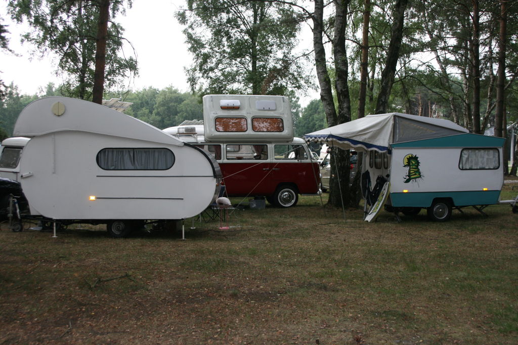 Bij onze aankomst op Dinsdagmiddag bleken er al een groot aantal leden en uiteraard ook Dennis en Hilde die het treffen organiseerden, aanwezig te zijn. Het werd dus even zoeken naar een passend plekje voor de auto, caravan en tentje, want ja wij zijn een groot gezin van 2 personen met 2 hondjes!! De weg naar de camping was perfect met pijlen aangegeven en dus dat was al de eerste meevaller, de volgende meevaller was de plek die we ter beschikking hadden, namelijk lekker schaduwrijk tussen de bomen en daar hebben we de eerste dagen toen het bloedheet was met temperatuuren van bóven de 30 graden ook ons voordeel mee gedaan. We hadden als BOCC de beschikking over een open gedeelte tussen de bomen zodat we een echte ouderwetse camping uit de zestiger jaren (past dus precies bij onze club) konden opbouwen, waarbij de caravans allemaal in de rondte konden staan en de kinderen in het midden konden spelen. Alleen is de leeftijd van de meeste leden al redelijk aangepast aan de leeftijd van hun caravan, zodat er weinig kinderen waren (van jonge leeftijd dan toch).